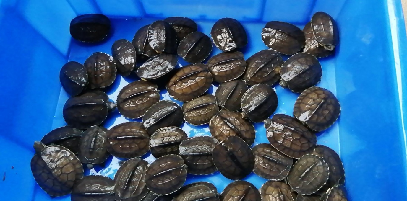 绿卡黄喉拟水龟苗选用珠江水系与广西北仑河的野生黄喉拟水龟进行选育,选择特征明显、个体大的黄喉拟水龟南方种群为亲本,采用群体选育和家系选育的方法,对引进的良种亲本经严格的检验检疫,选取符合标准的亲本,分池隔离标记进行强化培育,最大限度地保持和利用原种亲本的优良性状。“绿卡牌”黄喉拟水龟苗体质健壮、神态活泼、体色自然、双眼有神、体表光洁、抗病能力强、生长速度快